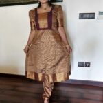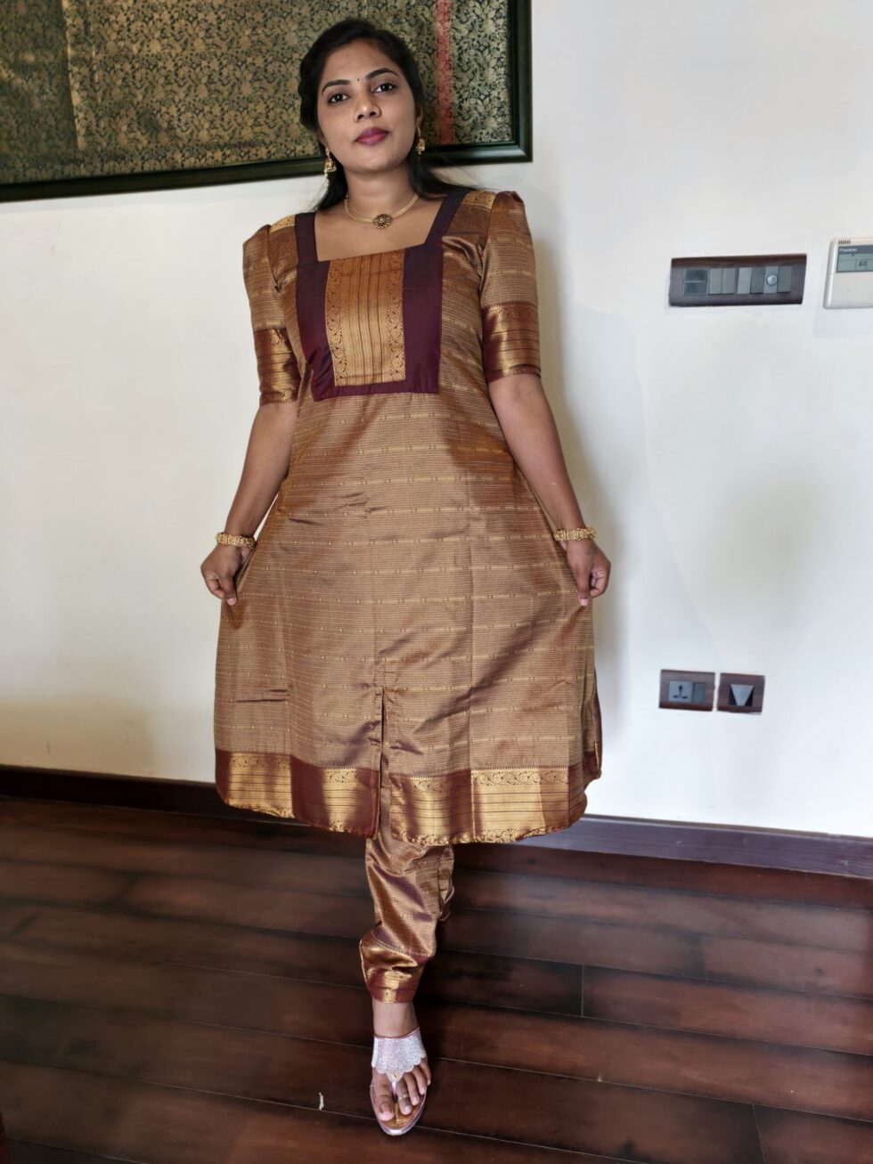 A luxurious ensemble crafted by transforming a grand bridal silk saree into a stunning umbrella-cut frock paired with a matching pant. The outfit showcases rich zari weaving throughout, enhanced with traditional pallu and border placements, giving it a royal and festive look. Perfect for bridesmaids, festive events, or traditional celebrations.