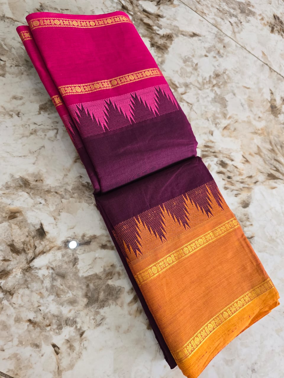 This elegant Ganga Jamuna cotton saree is made from soft, pure cotton. It features beautiful dual contrast borders on each side, inspired by the Ganga and Jamuna rivers. Light, comfortable, and perfect for both daily wear and special occasions.
