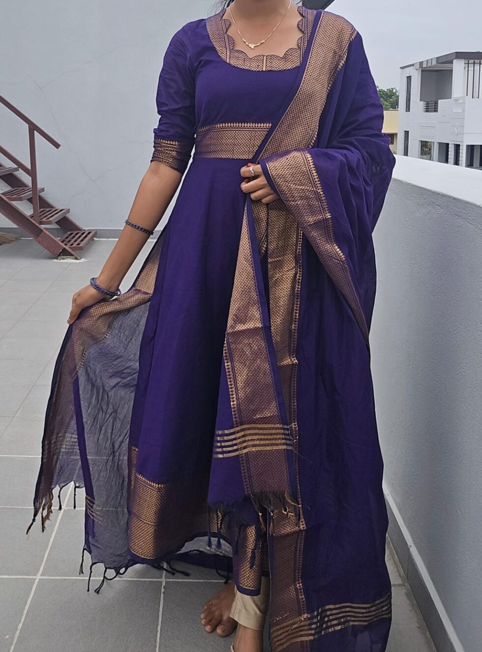 This beautiful long frock is made from pure Kaanchi cotton. It gives a rich and elegant look. The dress has a flared design, full sleeves, and a Amazing neckline. It is comfortable to wear and perfect for festivals, family functions, or casual traditional days.