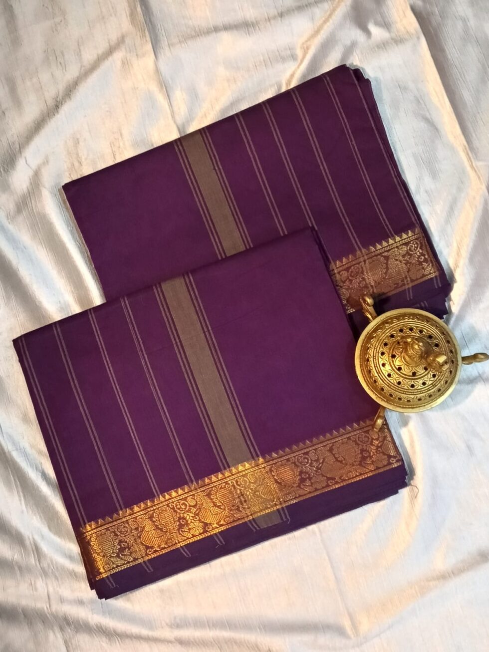 Step into timeless elegance with this exquisite Kaanchi cotton saree, crafted with traditional weaving techniques and adorned with rich zari motifs along the borders and pallu. The soft yet structured cotton fabric offers all-day comfort, while the intricate detailing adds a regal touch. Perfect for festive occasions, temple wear, or traditional gatherings. Comes with a matching running blouse piece for a complete ethnic look.