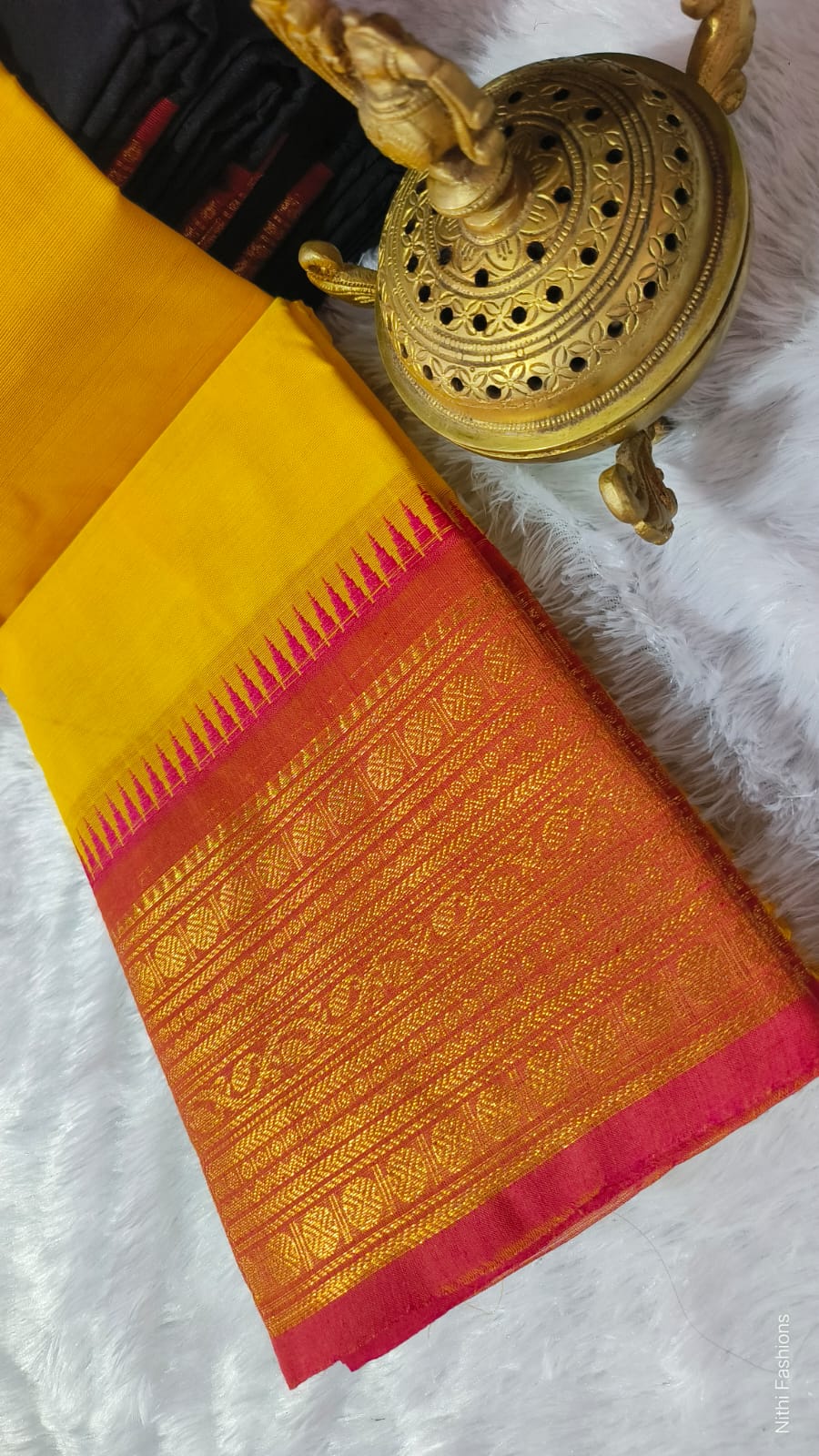 Elevate your traditional look with this elegant Kaanchi cotton saree, crafted with a rich zari border featuring intricate motifs. Designed for comfort and sophistication, this saree drapes beautifully, making it perfect for festive occasions, functions, and everyday elegance. Comes with a matching blouse piece to complete the look.