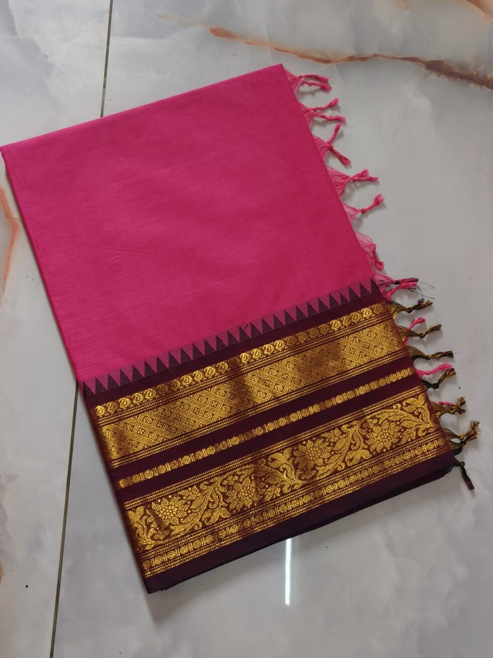 This Kaanchi cotton saree is made from soft, breathable cotton and comes with a traditional zari border. It is comfortable to wear and suitable for everyday use as well as special occasions.