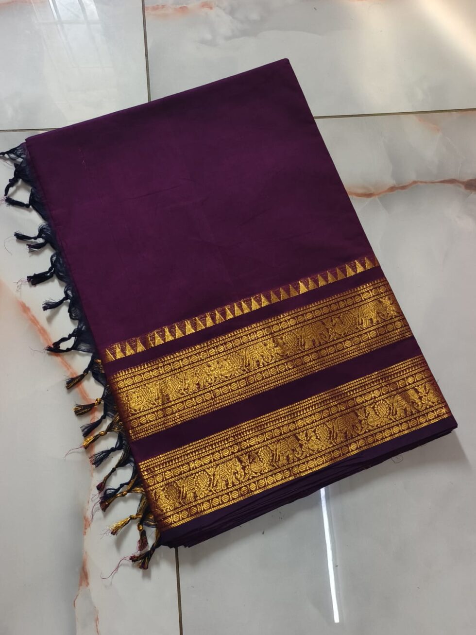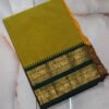 This Kaanchi cotton saree is made from soft, breathable cotton and comes with a traditional zari border. It is comfortable to wear and suitable for everyday use as well as special occasions.