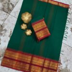 This Kaanchi cotton saree is made from soft, breathable cotton and comes with a traditional zari border. It is comfortable to wear and suitable for everyday use as well as special occasions.