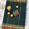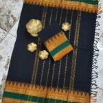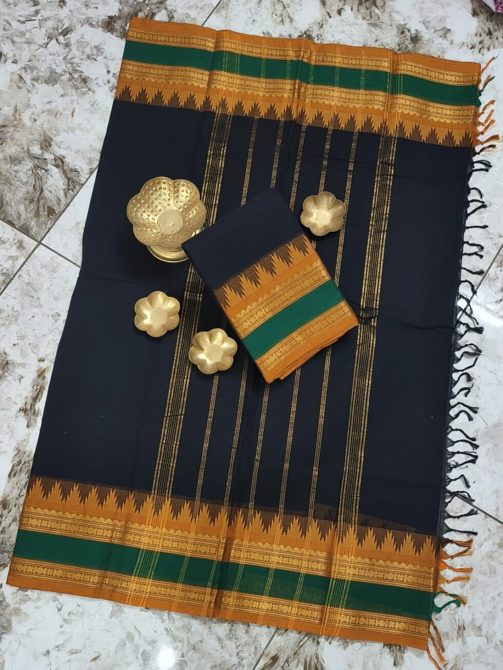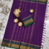 This Kaanchi cotton saree is made from soft, breathable cotton and comes with a traditional zari border. It is comfortable to wear and suitable for everyday use as well as special occasions.