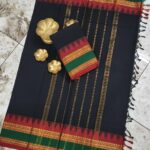 This Kaanchi cotton saree is made from soft, breathable cotton and comes with a traditional zari border. It is comfortable to wear and suitable for everyday use as well as special occasions.