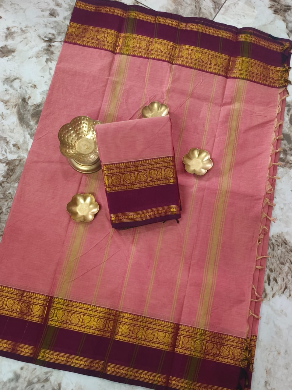 This Kaanchi cotton saree is made from soft, breathable cotton and comes with a traditional zari border. It is comfortable to wear and suitable for everyday use as well as special occasions.