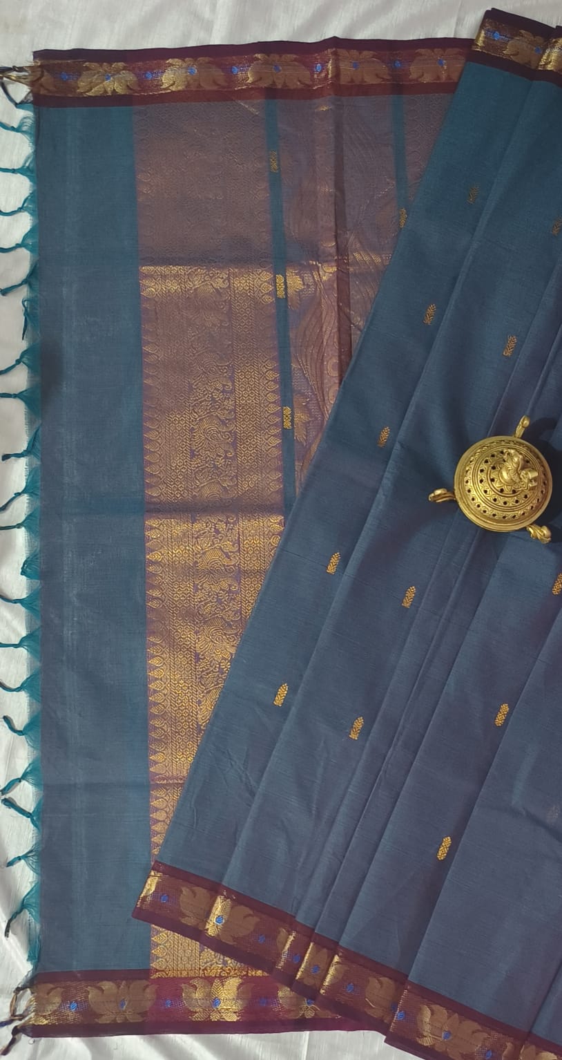 Step into timeless elegance with this exquisite Kaanchi cotton saree, crafted with traditional weaving techniques and adorned with rich zari motifs along the borders and pallu. The soft yet structured cotton fabric offers all-day comfort, while the intricate detailing adds a regal touch. Perfect for festive occasions, temple wear, or traditional gatherings. Comes with a matching running blouse piece for a complete ethnic look.