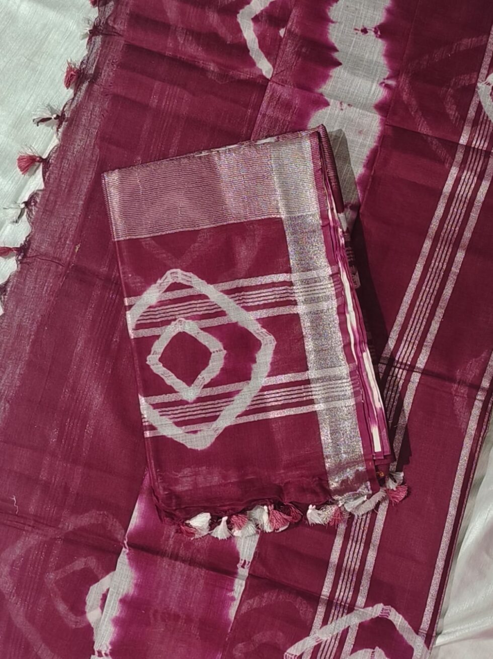 This saree is made from a blend of pure handloom linen and cotton. Linen is known for its strength and comfort, being derived from the flax plant fiber.