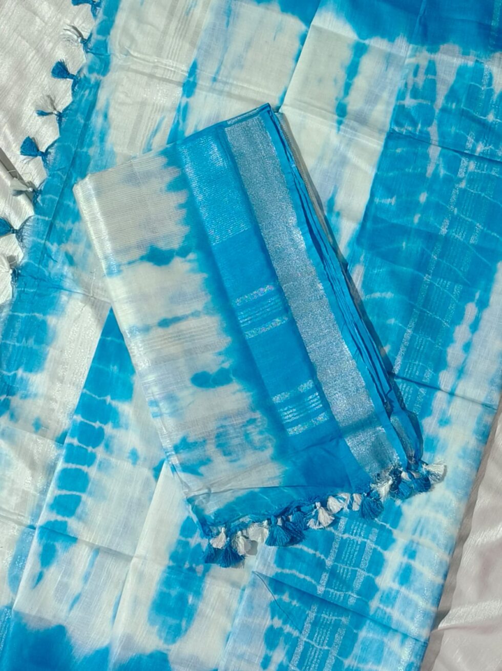 This saree is made from a blend of pure handloom linen and cotton. Linen is known for its strength and comfort, being derived from the flax plant fiber.