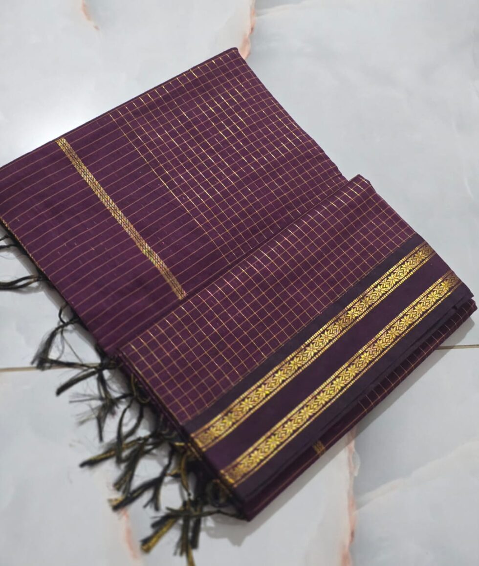 This elegant Kalyani Cotton Saree features a striking combination of lime green body with subtle checks and a rich deep purple Retta Pattu (double) border. The saree is handloom with traditional craftsmanship, enhanced by golden zari motifs along the border for a classic and graceful South Indian look.