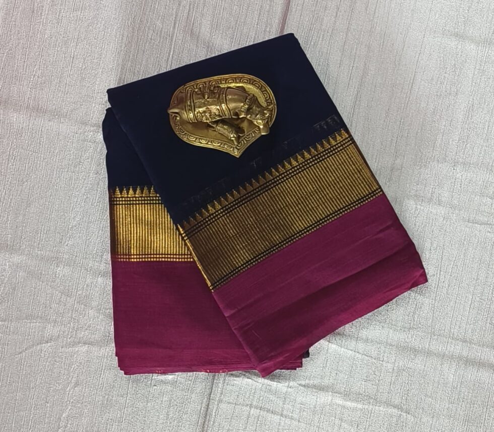 These sarees have borders and pallu in a contrasting colour with heavy gold weaving. Kanchipuram sarees traditionally had designs representing simple gold lines or gold dots. The designs on these sarees were inspired by the designs in South Indian temples or natural elements like birds, leaves, etc.