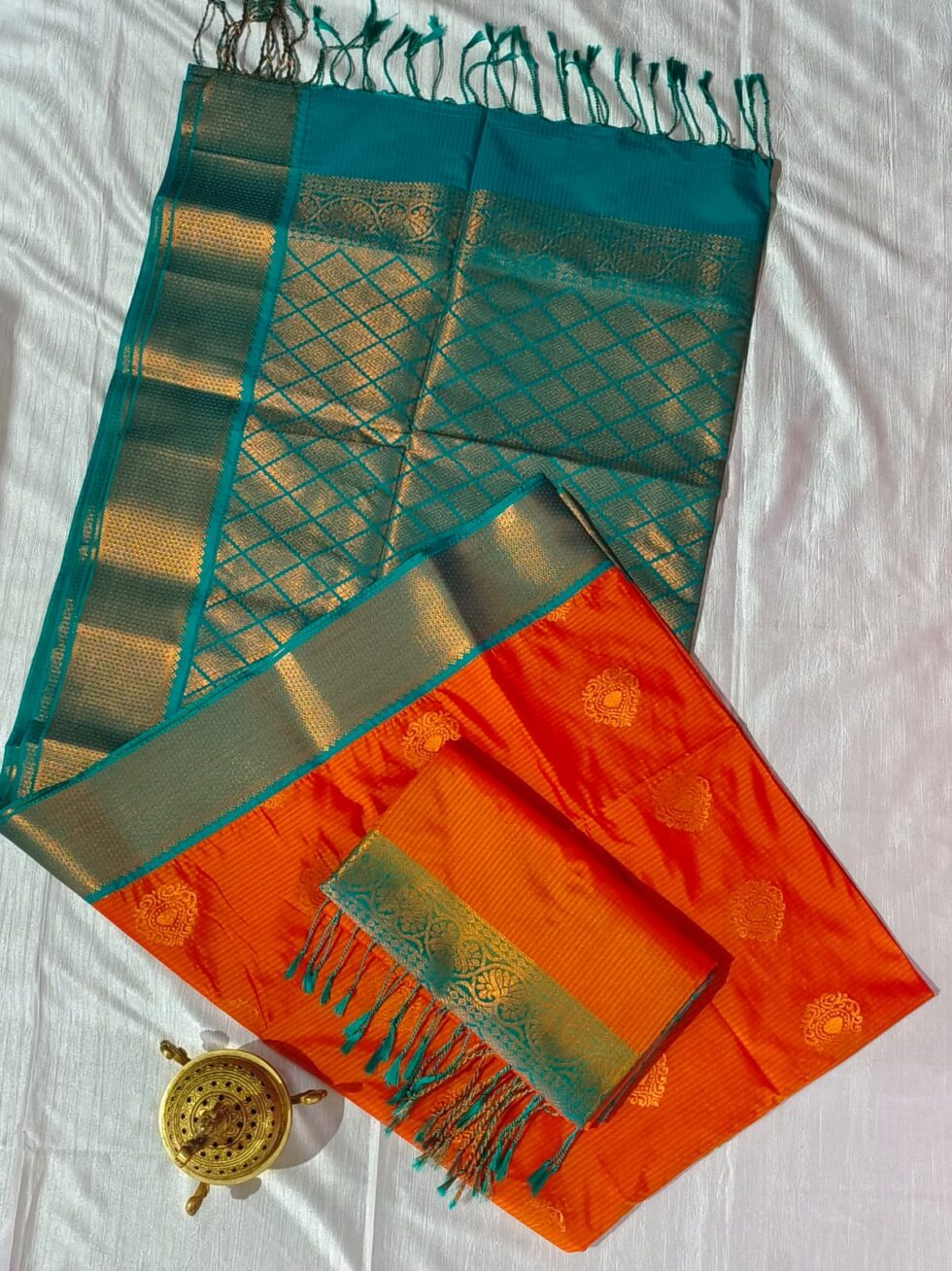 • The Tamil word ‘Korvai’ means ‘In Sync’. As simple as it sounds, this ancient method is the true symbol of the Kanjivaram silk saree and Yes, at Singhania’s we are very proud of our Korvai collection. In weaving a Korvai saree the weaver is manually attaching the body part of the saree with the borders.