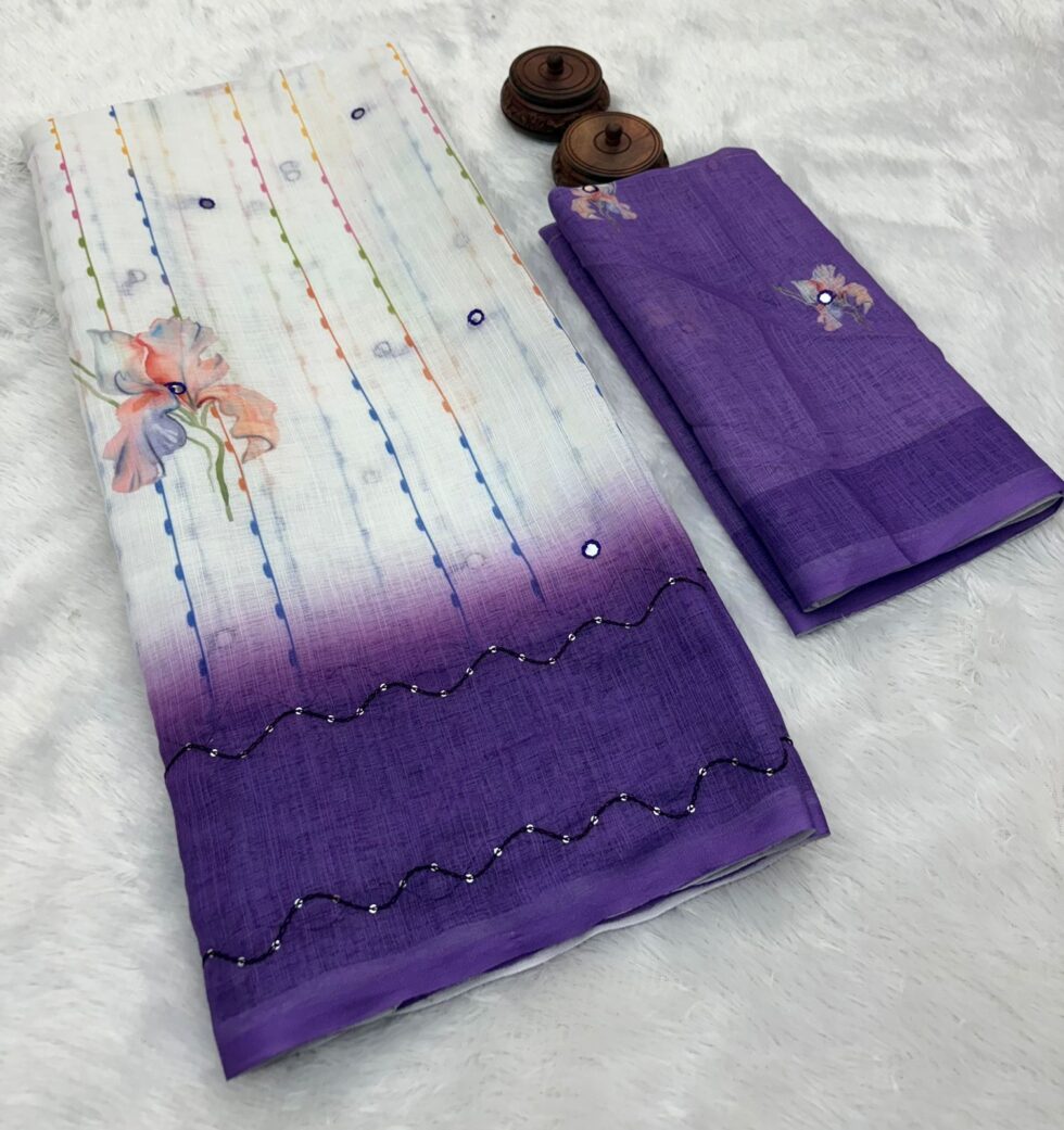 The saree is made of Gadhwal Linen Cotton, and it comes with a Muslin Cotton blouse piece.