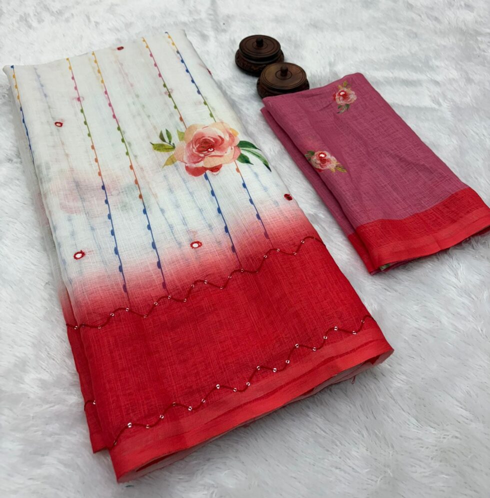 It is adorned with intricate hand Kantha thread work and mirror work, particularly noticeable on the border with a cutwork pattern and throughout the saree with flower motifs (khatliwork).