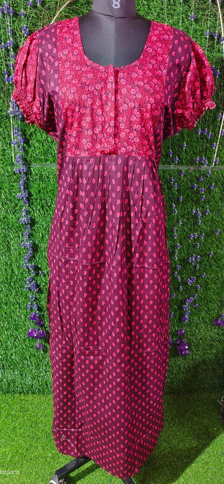 Experience all-day comfort with this pure cotton nighty, crafted in our own manufacturing unit with the finest stitching and finishing. Designed for breathability and softness, it is perfect for everyday home wear and a restful night’s sleep. The floral print with contrast patterned yoke, buttoned front, and puff sleeves gives a touch of charm while keeping the fit relaxed and airy.