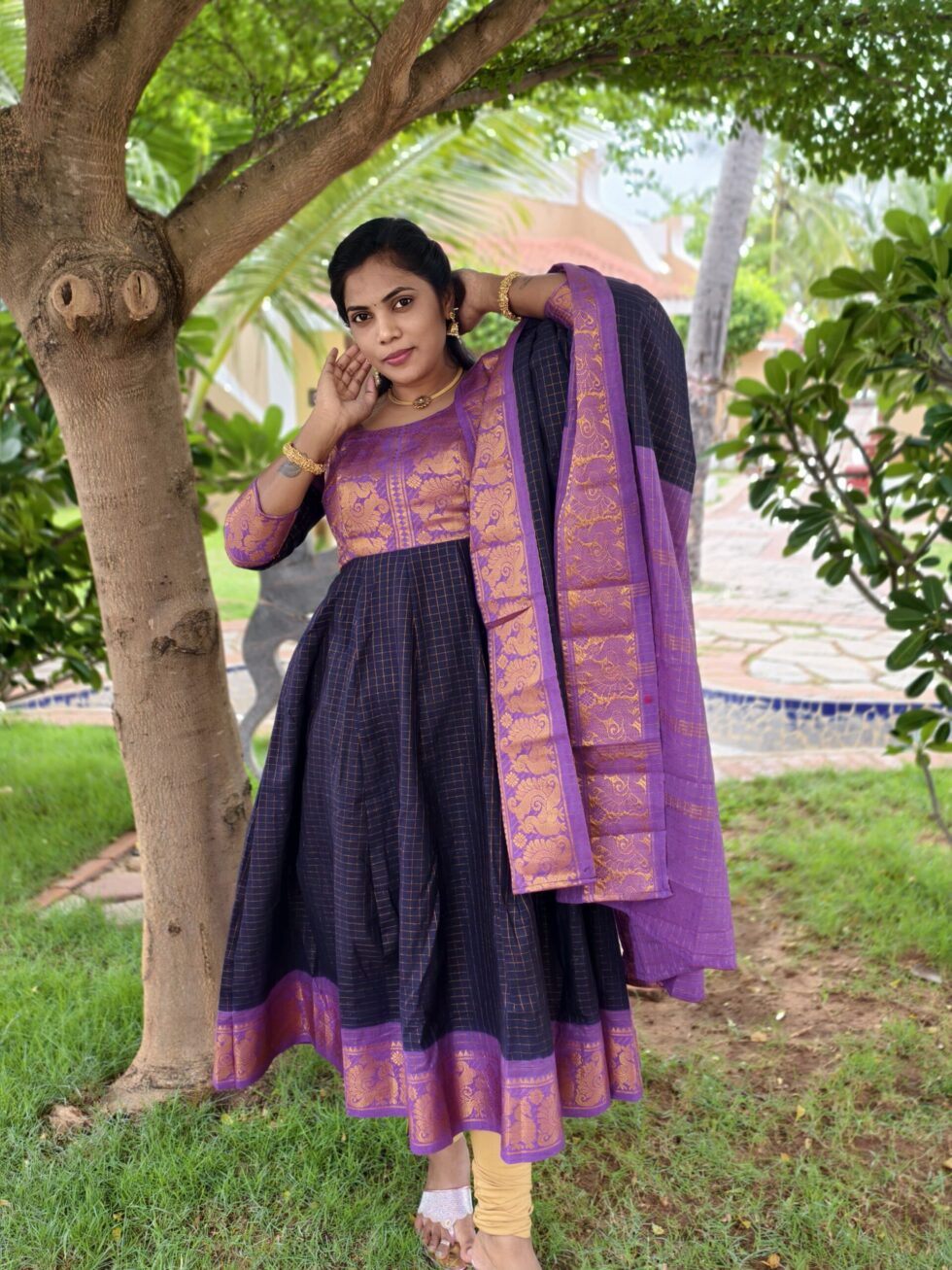 Step into elegance with this beautifully handcrafted frock made from an authentic Sungudi cotton saree. Featuring intricate traditional weaving and a rich zari border, this frock blends timeless heritage with modern comfort. The matching shawl completes the look, offering a graceful and coordinated appearance.