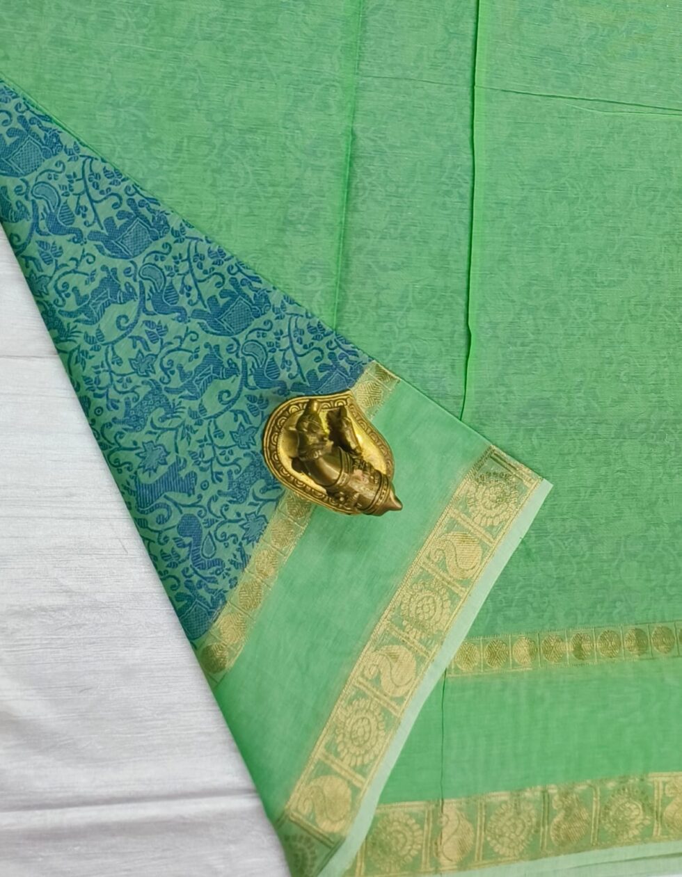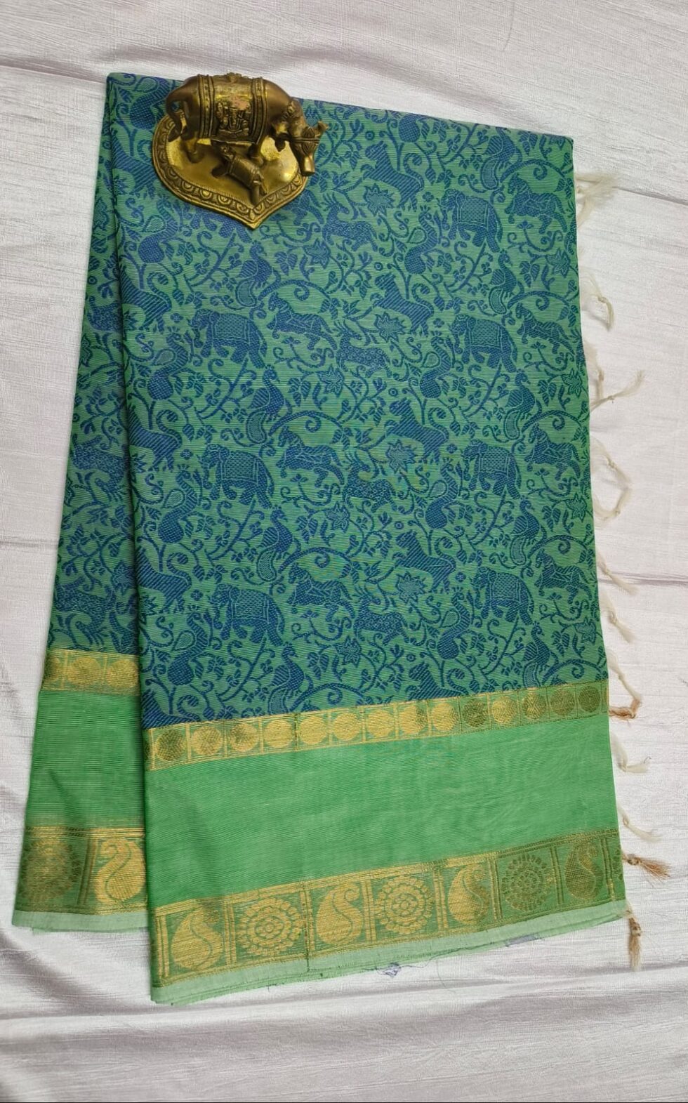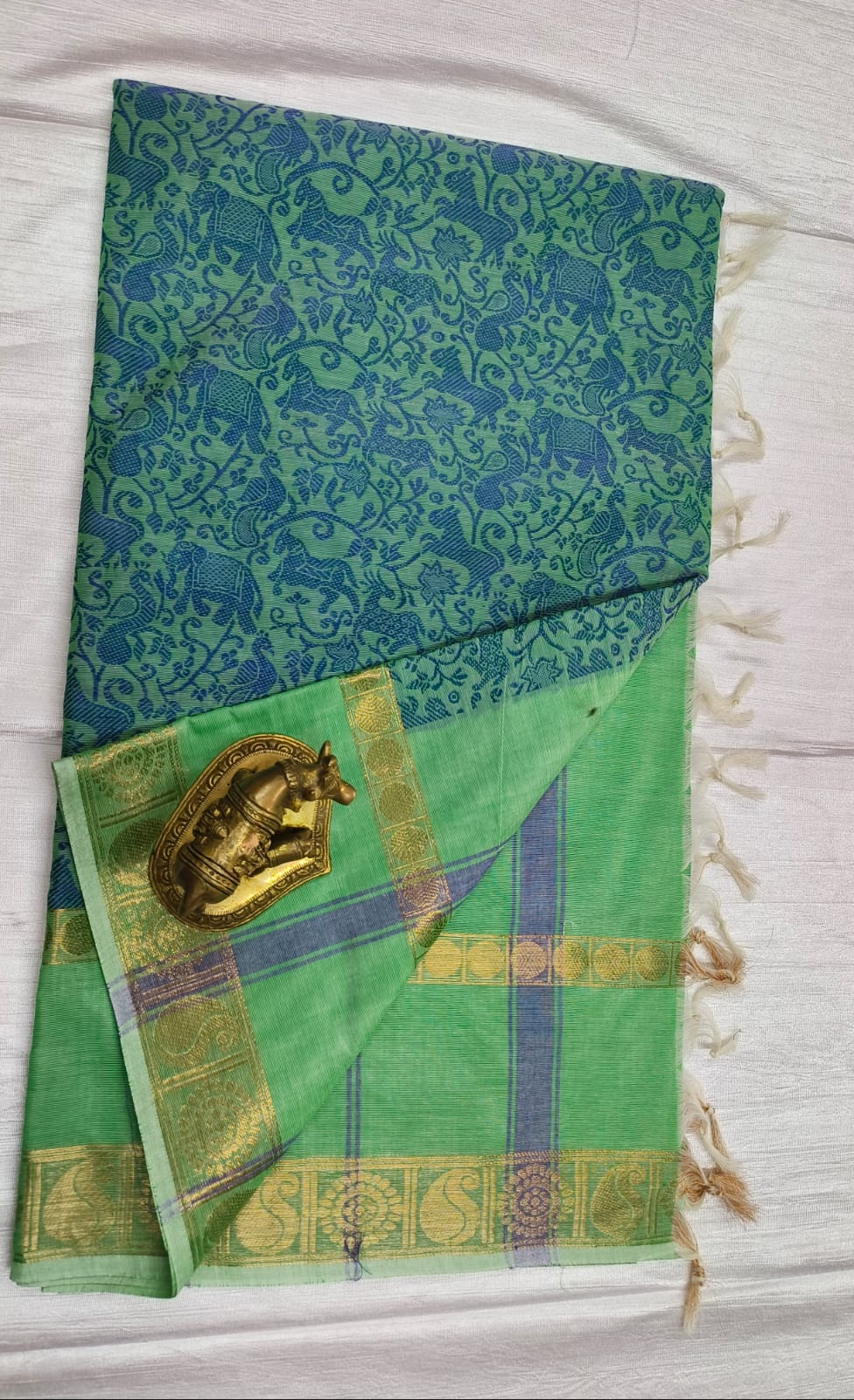 Vanasingaram literally translates to “Glory of the forest”. True to its name, this beautiful mubbagam in latte, turmeric and fresh green adorns Creepers, ornate paisleys to Peacocks, Deers, Horses, Elephants, and Lions in the turmeric yellow centre, all over the saree.