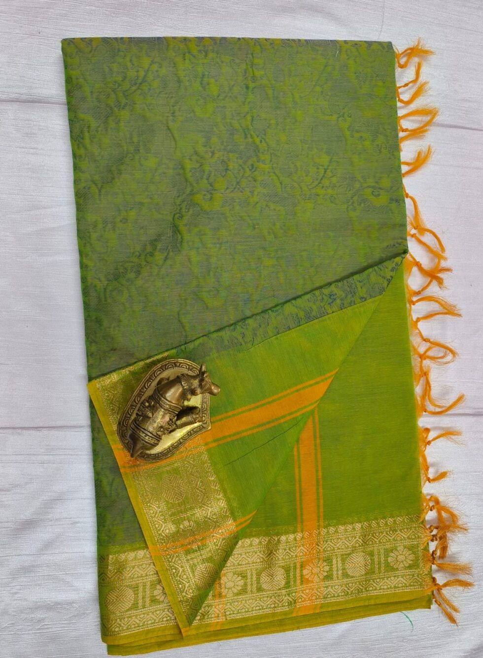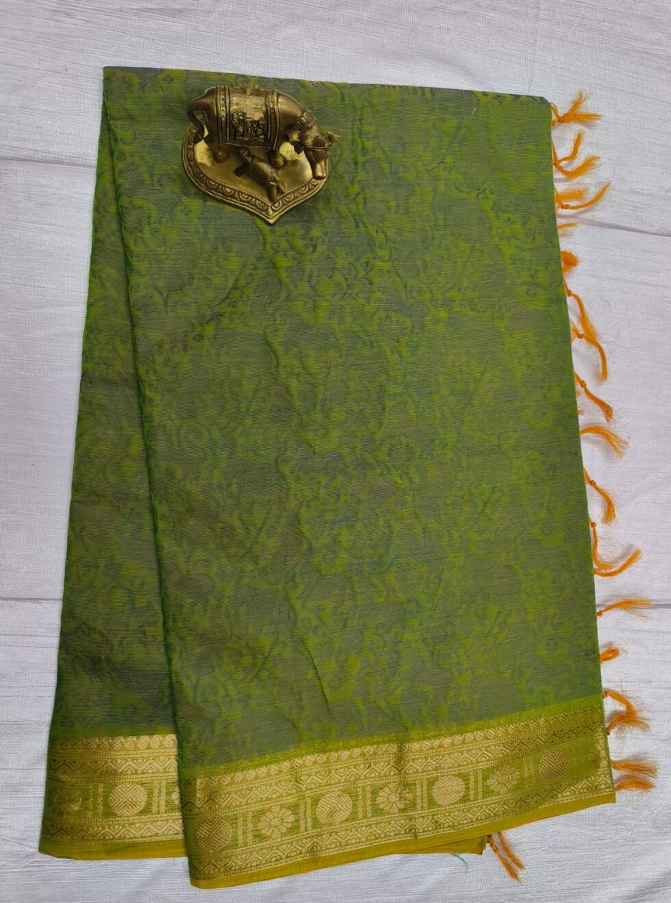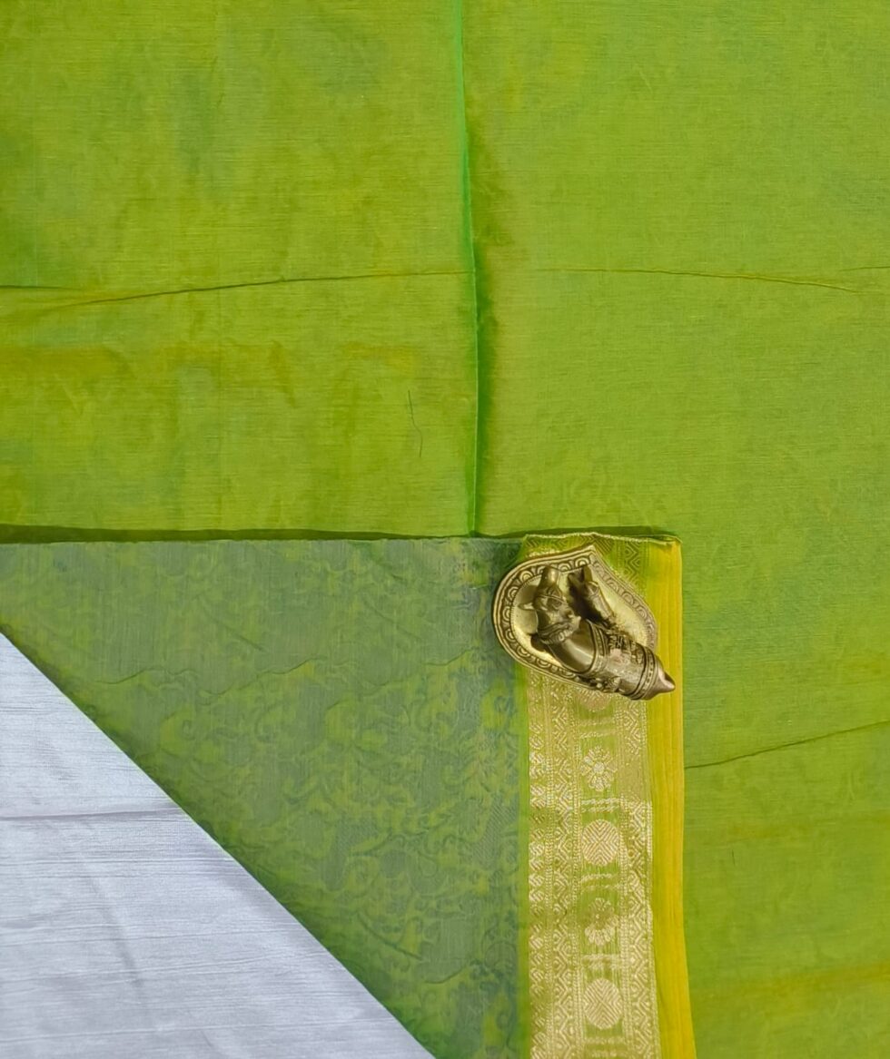 • Vanasingaram literally translates to “Glory of the forest”. True to its name, this beautiful mubbagam in latte, turmeric and fresh green adorns Creepers, ornate paisleys to Peacocks, Deers, Horses, Elephants, and Lions in the turmeric yellow centre, all over the saree.